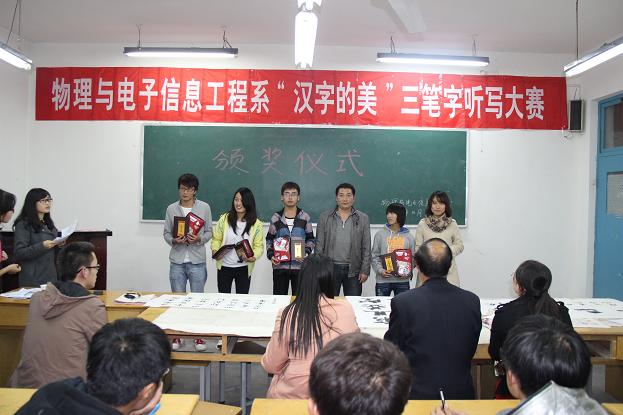 本次比赛分毛笔、粉笔、钢笔三种形式。从10月22日开始的各班初赛参加人数257人到复赛时的139人,直至10月30日进入决赛的毛笔组9人、钢笔组9人、粉笔组9人,物理与电子信息工程系共计270人参与到这个活动中。