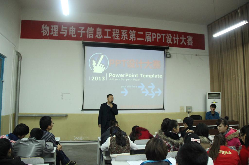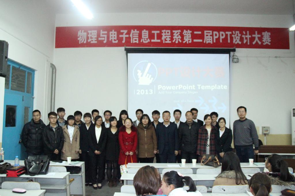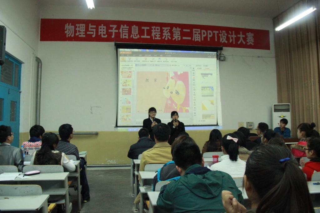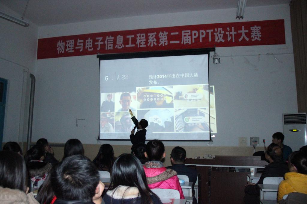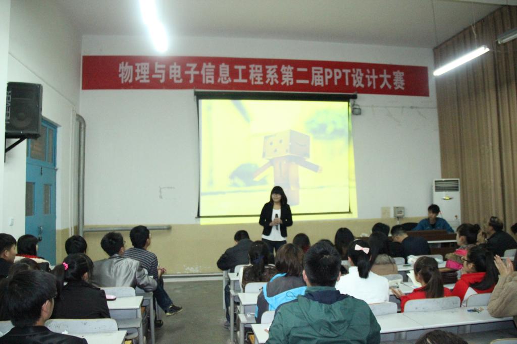 本次大赛从11月11日的初赛共收录39份参赛作品,直至11月17日决赛共有9组选手脱颖而出。参赛选手纷纷对自己设计的PPT作品进行了演示与解说,选手作品立意新颖,色彩搭配协调,框架清晰,美观大方。其中,吴婷同学的《女孩与梦想》图片、文字、音乐、动画与主题相吻合,讲解生动。张远兆、王伟良同学的《无线充电技术》不仅与所学物理知识相联系,更是为我们展示了这一技术的方便快捷。田远同学的《Google》与张舜君、汪雷同学的《求知若饥》从同一方面为我们展现了两个高科技技术的发展前景,以及他们创造者的心路历程,有付出才有收获。