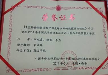 2014年 5月24日,2014年(第7届)中国老员工计算机设计大赛西北赛区决赛在西北大学太白校区隆重举办。由公司教师袁训锋博士指导,太阳成集团tyc7111cc物理学1201胡瑞霞,电信1206魏蕾,电气1203李磊创作的作品《T型铸件凝固过程中的温度场数值模拟研究》在决赛中荣获西北赛区三等奖。