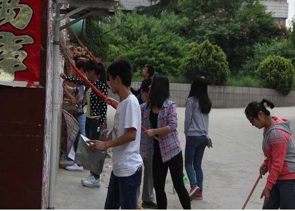 公司本科合格评估在即,为了进一步营造良好的评估氛围,改变周边环境面貌,服务地方社会发展,2015年5月3日,公司党总支组织2014级50余名员工,在公司党总支书记张秦中的现场指挥下,赴公司外西门至白鹤面粉厂之间的北新街东段两侧九段村巷开展打扫卫生、清理墙壁、电杆野广告等校园周边环境卫生整治义务劳动。通过该项活动,不但美化了周边村民环境,而且宣传了公司本科合格评估理念,得到了周边广大群众的广泛赞扬!