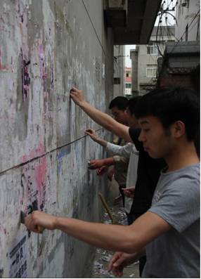 11点整,在同学们的齐心协力之下,街道墙面变得干净整洁,看着经过自己亲手清理而变得洁净的街道村巷和墙面,大家脸上都露出了会心的笑容。在热火朝天的劳动之余,参与同学纷纷表示本次活动过程虽短、强度虽小,但的确是踏踏实实的一次锻炼。参与活动的教师也勉励大家切勿高谈阔论、眼高手低,只有踏实地从身边的每件小事出发,做好每个人应尽的责任和义务,才能真正地成长,才能不断为评估作贡献。