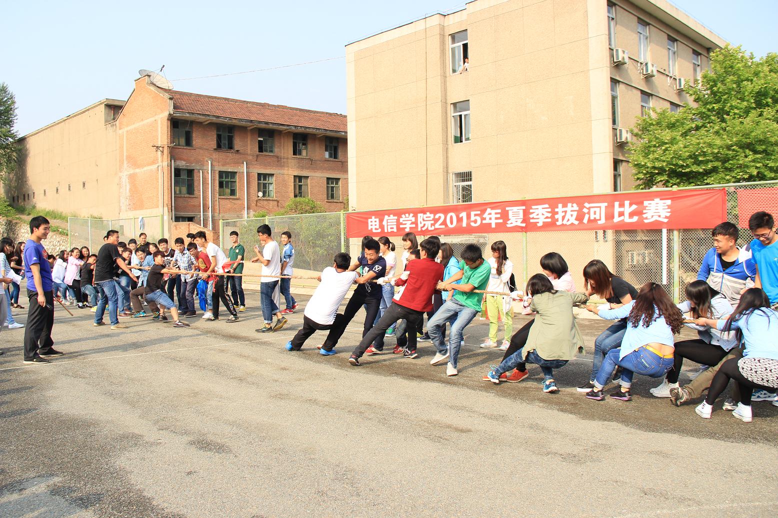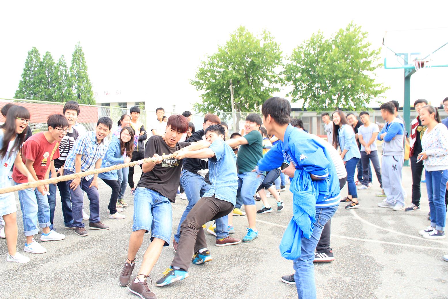 参加本次比赛的有2013级、2014级各班同学分别组成的7支队伍,每队14人男女混搭进行参赛。下午四点,比赛正式开始,比赛场上只见参赛的同学们精神抖擞,一个个相互鼓励,脸上闪动着坚定的神情。随着哨声响起,队友们喊着“一二,一二”的口号向自己方向拼命拉绳。同学们也自发的组成拉拉队为各班同学加油。赛场上欢呼声,呐喊声此起彼伏,处处散发着青春的气息,整个场面激烈而温馨,团结协作的力量在一条长绳之间传递。