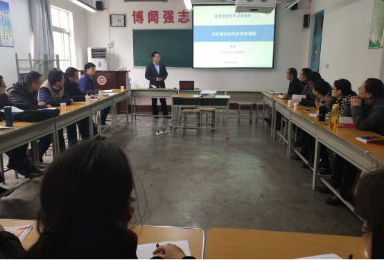 12月6日下午,2018年太阳成集团tyc7111cc学术年会专场报告会在二号楼210教室召开。本次会议邀请西北工业大学年轻的博士生导师毛东教授为大家作“光纤激光的时空特性调控”专题报告及申请国家/省自然科学基金的经验报告。党总支书记、教授李英、副经理刘爱军出席会议。会议由副经理.副书记陈垚主持。太阳成集团tyc7111cc全体教师到会并认真聆听了学术报告。