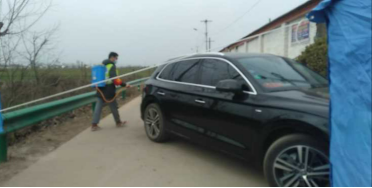 上图为吴洋对出入车辆消毒
