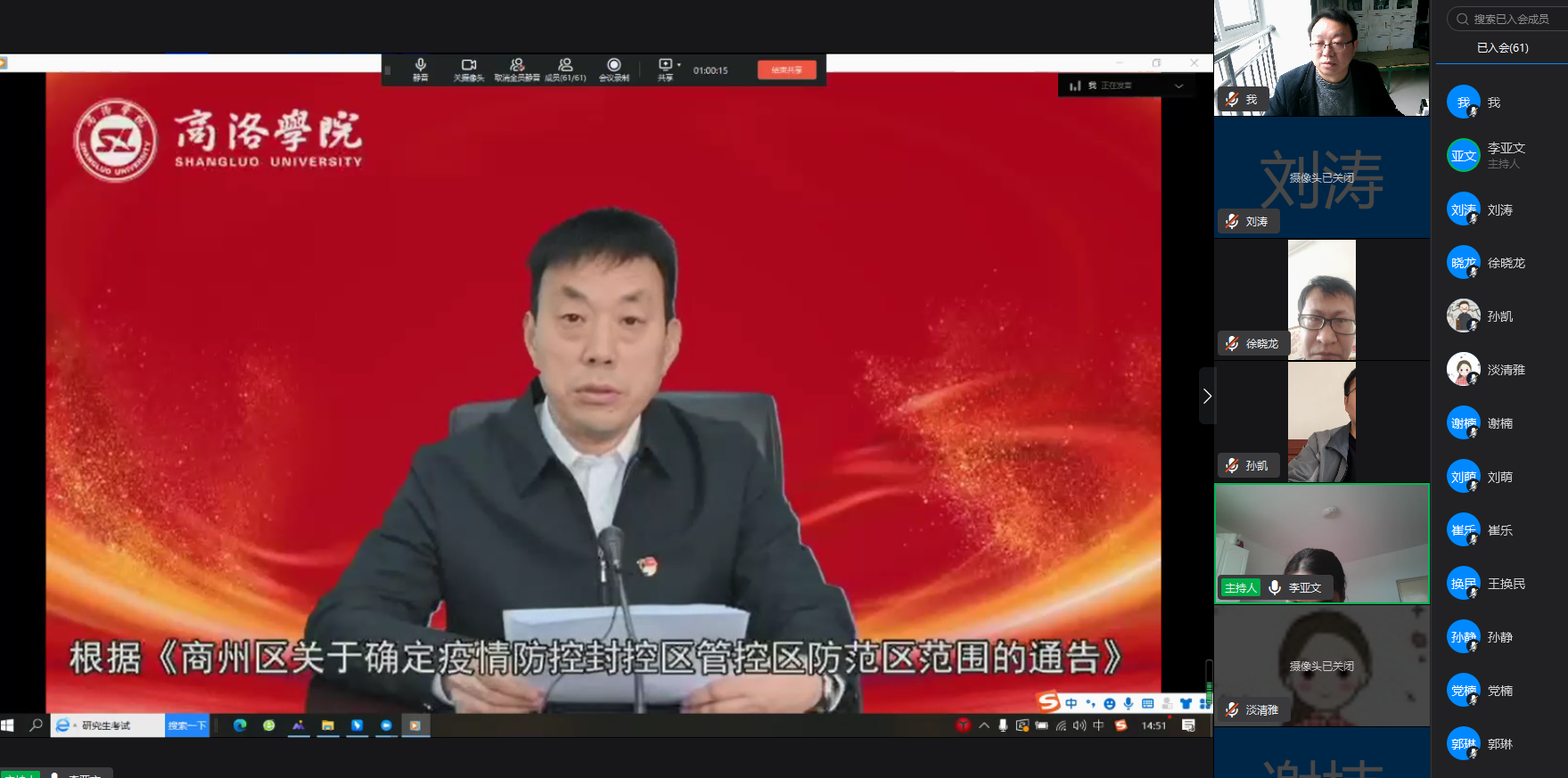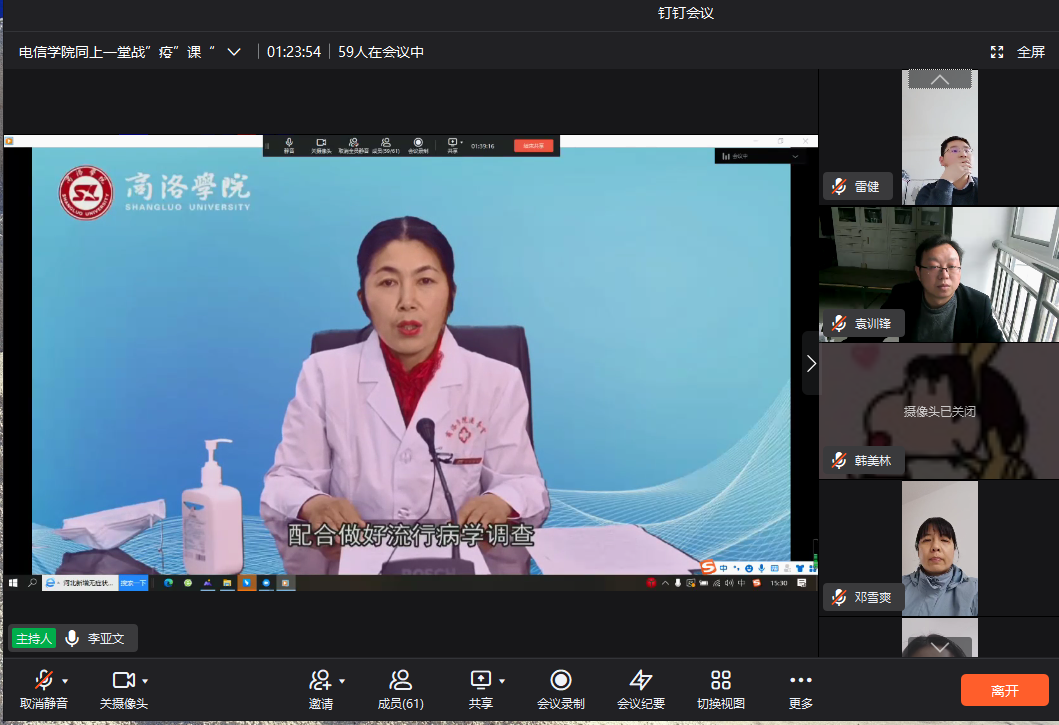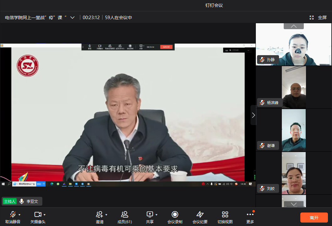 为进一步做好校园封闭管理期间疫情防控工作,提高师生思想认识和疫情防控知识,提振战“疫”必胜信心,根据公司《关于组织开展万名师生同上一堂战“疫”思政课的通知》精神,4月16日下午,太阳成集团tyc7111cc组织全体师生通过线上钉钉群直播的方式收看学习了公司党委书记张志昌、董事长范新会、党委副书记彭虎军和后勤保障处医务室主任任秀梅的专题战“疫”思政课,为广大师生宣讲疫情防控知识,解读公司防控政策。线上学习分教师组和六个员工组进行,分别由副经理李亚文和全体辅导员主持。党总支书记李英、经理袁训锋率全体61名教职工和1401名员工参加了线上学习。