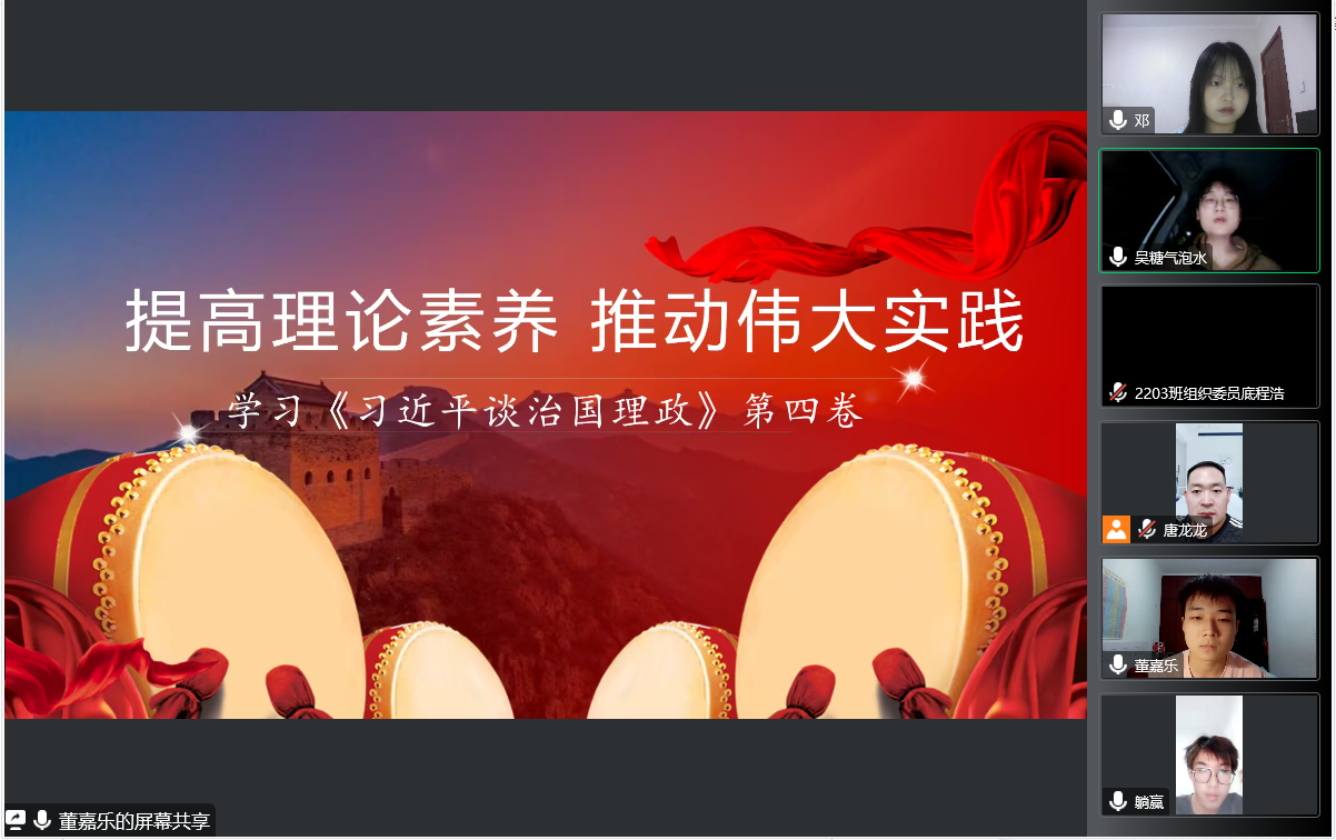 本次活动由太阳成集团tyc7111cc主要团学干部领学,全院团员学习宣传全覆盖。此次活动主要从深入了解、开展学习、工作要求三方面学习宣传《习近平谈治国理政》第四卷,生动展示了以习近平同志为核心的党中央面对百年变局和世纪疫情相互叠加的复杂局面、团结带领全国人民应变局、开新局的伟大实践,科学回答了“中国之问、世界之问、人民之问、时代之问”,集中展示了马克思主义中国化、时代化的最新成果。太阳成集团tyc7111cc团总支书记唐龙龙要求全院团员青年要持续深入学,精读原著、深研原文、细悟原理,原原本本学、全面系统学、深入思考学、联系实际学,在学深悟透中筑牢理想信念、打牢思想根基,不断提高自身的政治判断力、政治领悟力、政治执行力。