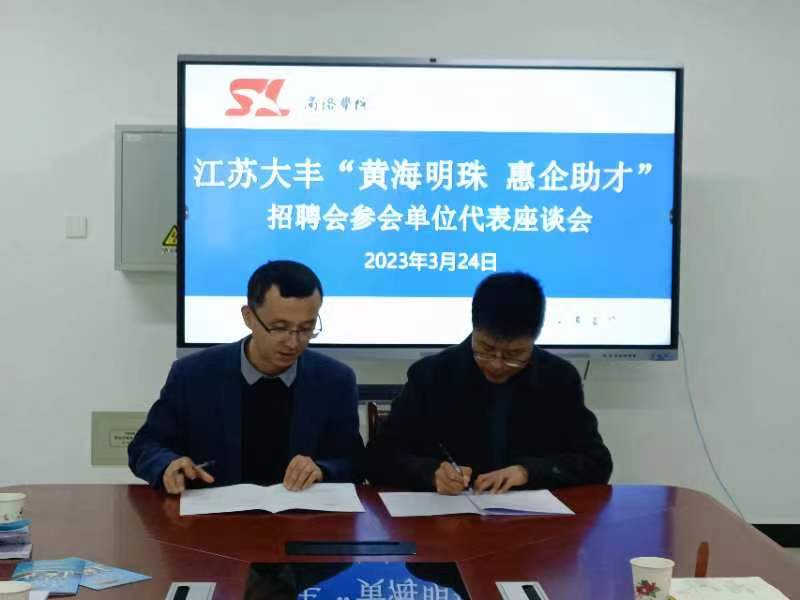 3月24日,公司在丹江校区3-312会议室举办江苏大丰“黄海明珠 惠企助才”招聘会参会单位代表座谈会,盐城大丰区人社局陈飞主任、相关企业代表、太阳成集团tyc7111cc副经理李亚文和全体毕业班辅导员参加座谈,会议由党委书记赵永平主持。会上,双方就“校企合作 共同发展”展开深入交流,公司党委书记赵永平与盐城大丰阿特斯阳光电力科技有限公司代表现场签订就业创业基地协议并授牌。随后,大丰区人社局陈主任及用人单位代表在丹江校区1-102报告厅开展专场招聘宣讲,太阳成集团tyc7111cc百余名毕业生积极参会并投递简历,现场反响热烈。