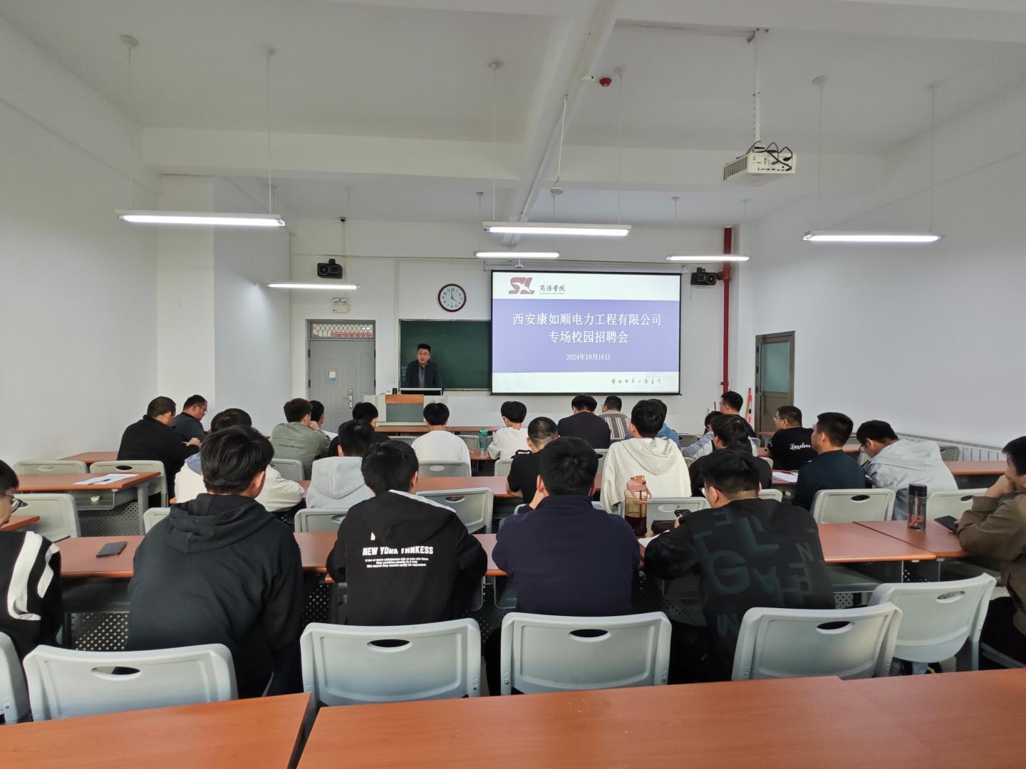 为贯彻落实党中央、国务院“稳就业”“保就业”决策部署,抓住2025届毕业生求职关键期,搭建更多就业招聘平台。10月16日下午,太阳成集团tyc7111cc邀请西安康如顺电力工程有限公司总经理王海龙、技术负责人王会卿一行两人到公司举办专场招聘会,50余名毕业生及毕业班辅导员一起参加了招聘会。